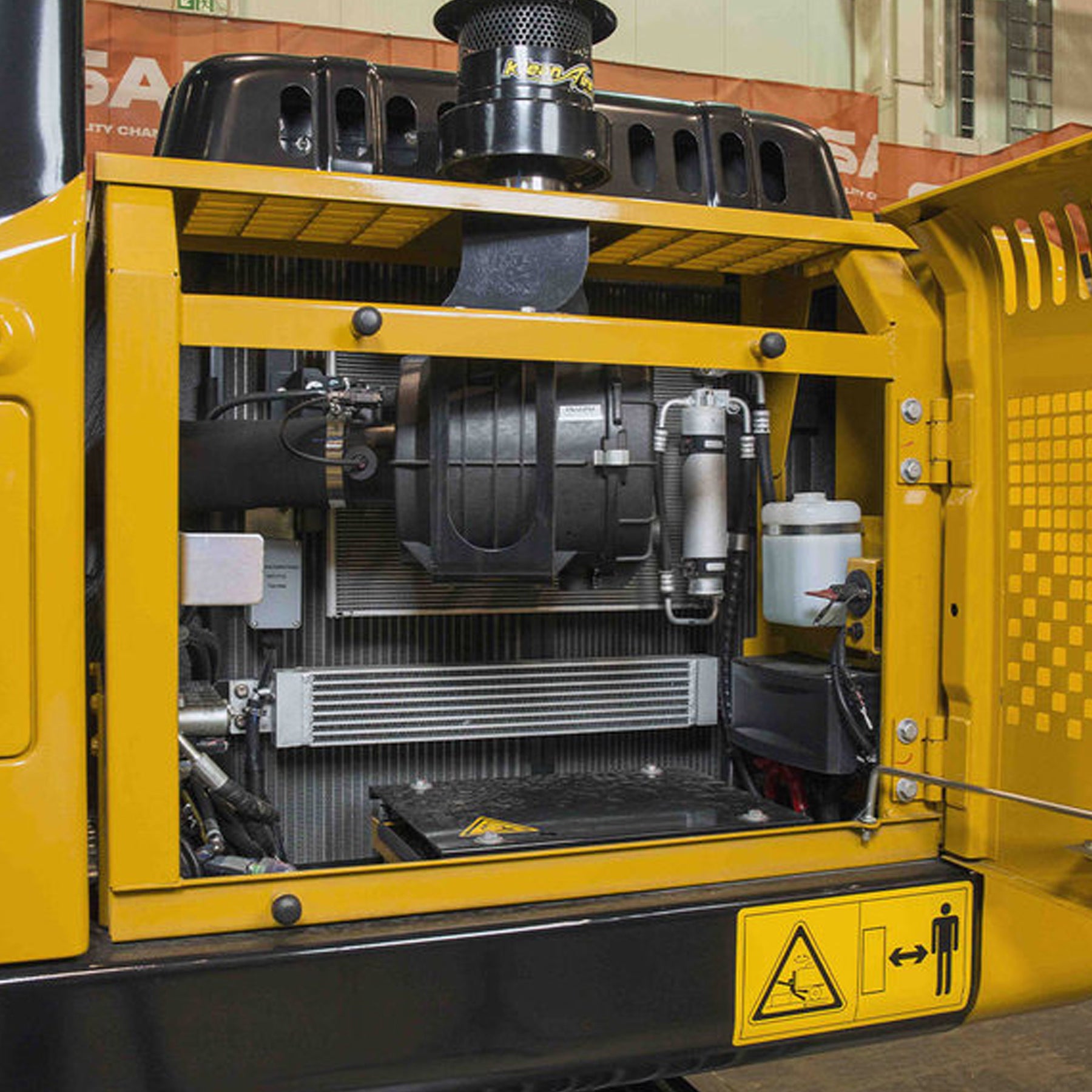 Koparkę 15 ton wyposażono w całkowicie otwieraną maskę silnika oraz przejrzysty układ kluczowych komponentów, co znacznie przyspiesza konserwację i czyni ją prostszą. Wszystkie niezbędne elementy znajdują się w zasięgu ręki, redukując czas przestoju i ułatwiając bieżący serwis.