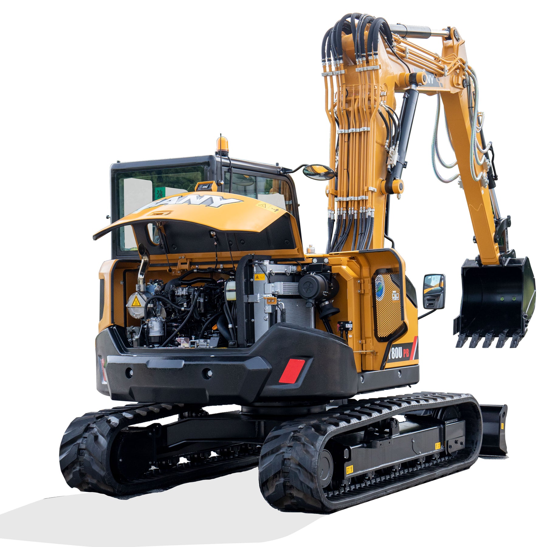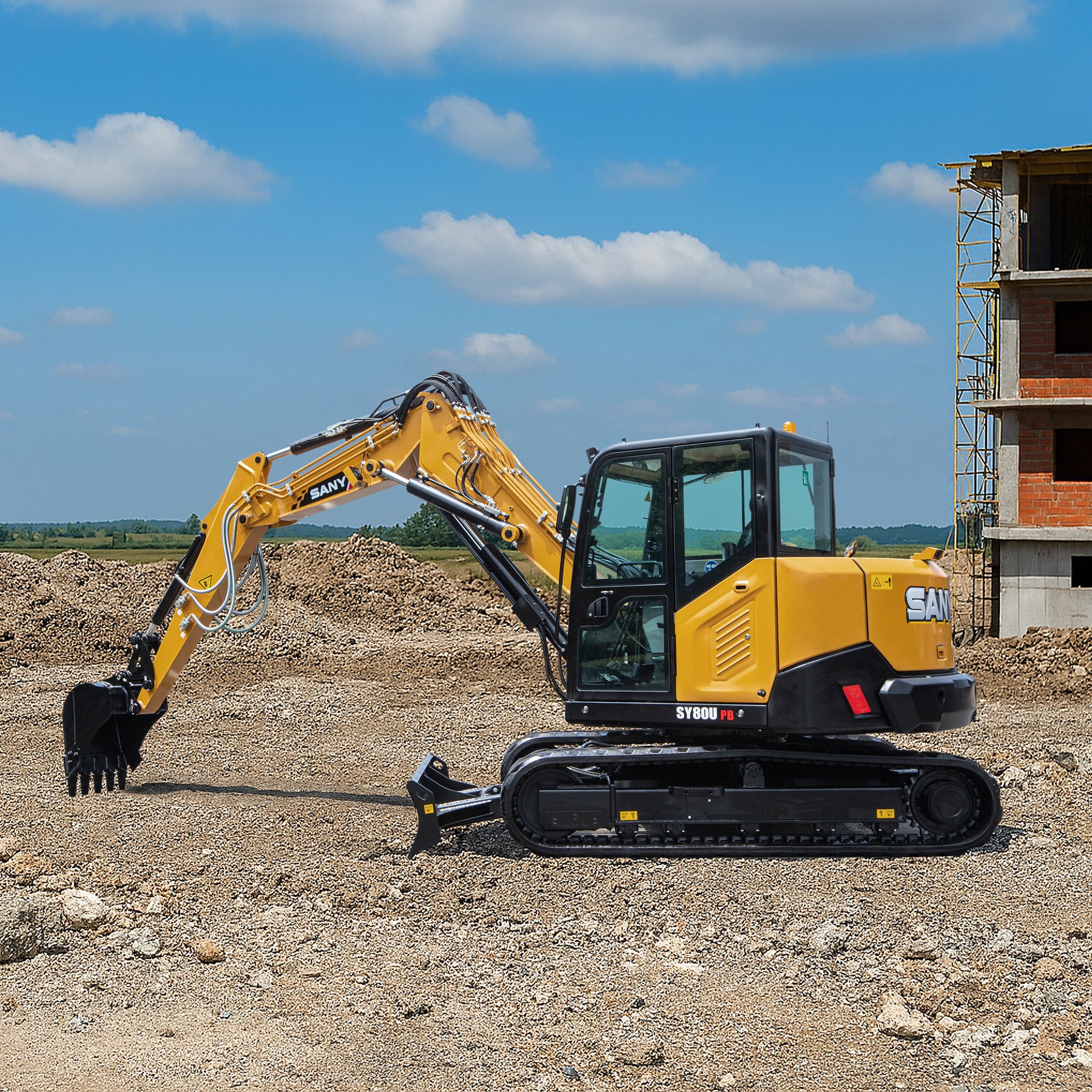 Model SY80U PB to kompaktowa koparka gąsienicowa o masie operacyjnej ok. 8,8–9,6 tony, wyposażona w silnik Yanmar 4TNV98CT o mocy 53,7 kW (72 KM), spełniający normy emisji spalin Stage V. Maszyna osiąga imponującą głębokość kopania do 4 520 mm i wysokość rozładunku ok. 5 430 mm. Kluczowym elementem tej wersji jest dwuczęściowe ramię PB (Pivot Boom), które umożliwia elastyczne manewrowanie w ciasnych przestrzeniach miejskich i przemysłowych.