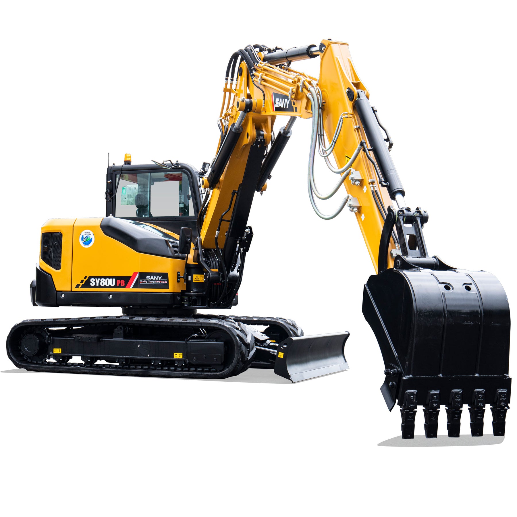 Profesjonalna koparka kompaktowa SY80U PB o masie 9 580 kg z silnikiem Yanmar 4TNV98CT (53,7 kW / 72 KM) została wyposażona w podwójnie łamane ramię typu Pivot Boom. To rozwiązanie zapewnia większą elastyczność manewrowania w ciasnych przestrzeniach oraz zwiększony zasięg roboczy – idealne w pracy komunalnej, budowlanej i usługowej.