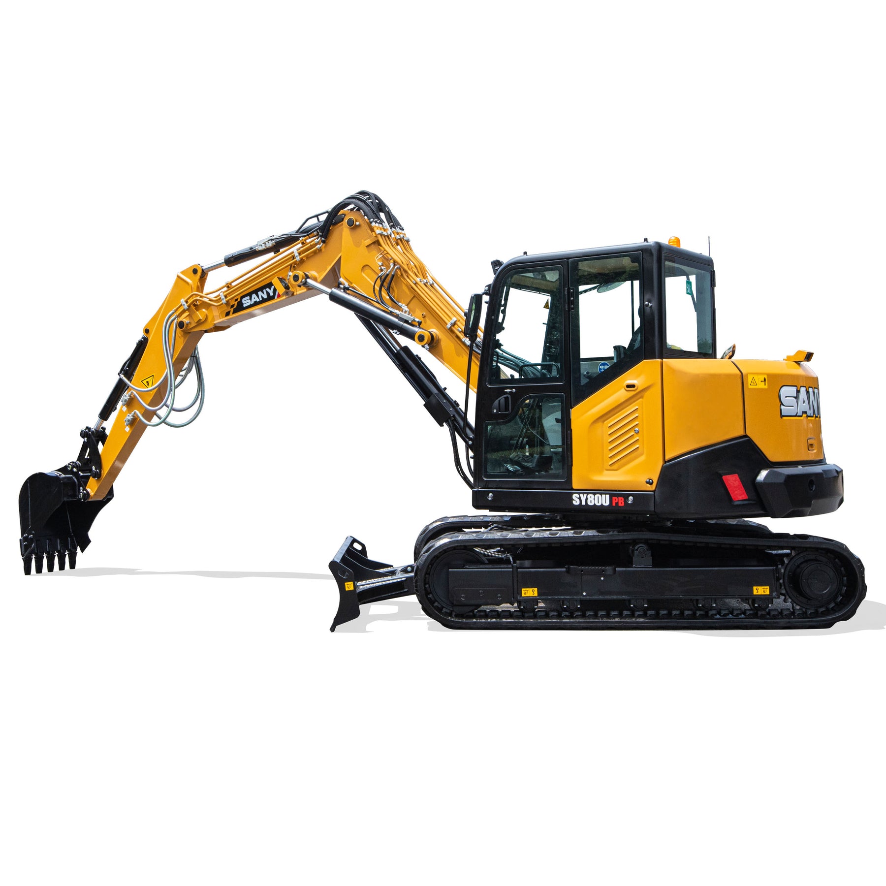 Koparka SY80U PB została wyposażona w systemy zwiększające bezpieczeństwo pracy: zawory bezpieczeństwa chroniące układ hydrauliczny, wzmocnione osłony elementów roboczych oraz doskonałą widoczność z kabiny. Dodatkowe elementy, takie jak szerokie lusterka i oświetlenie LED, zwiększają bezpieczeństwo w trudnych warunkach terenowych i pogodowych.
